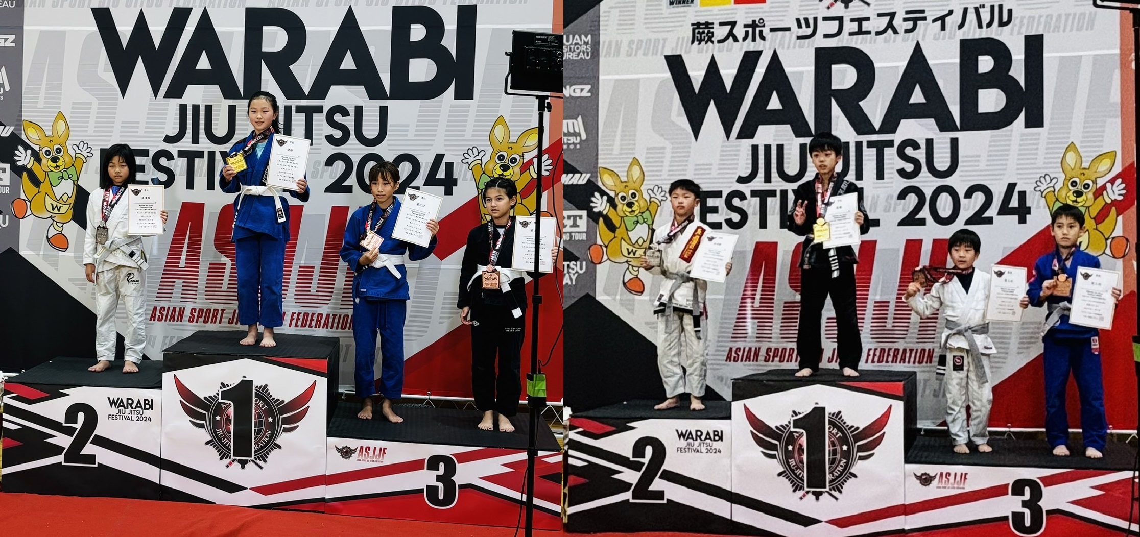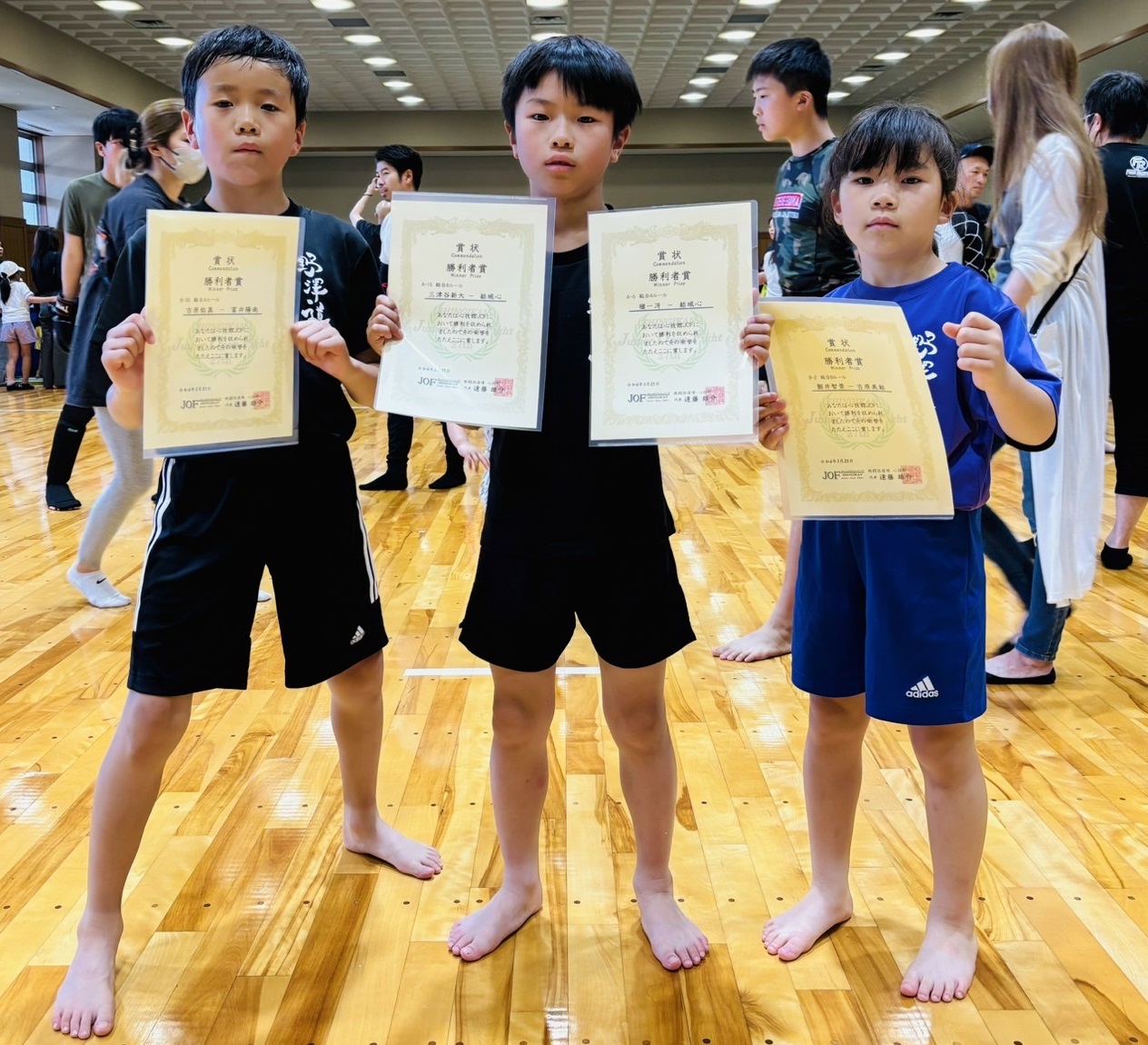 2024.11.3 蕨柔術フェスティバル・蕨市民体育館 女子、白帯、小5、ライト級 優勝・結城咲良 男子、灰帯、小3、フェザー級 準優勝・結城心